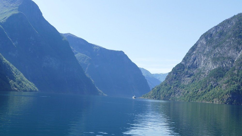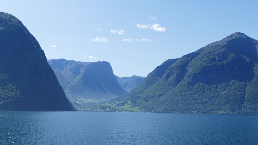 Das gute Wetter muss genutzt werden, wir buchen im Touristenbüro „Norway in a nutshell!“ Ein Schnellboot bringt uns am nächsten Morgen in fünfeinhalb Stunden mit 30 Knoten (fast 60 kmh) bis nach Flam in den Sognefjord. Dieser ist insgesamt fast 200 km lang. An vielen Stellen ist das Wasser so tief, wie manche ihn umgebene Berge hoch sind: über 1000 Meter. Man hat wirkllich den Eindruck weit über NN zu sein.