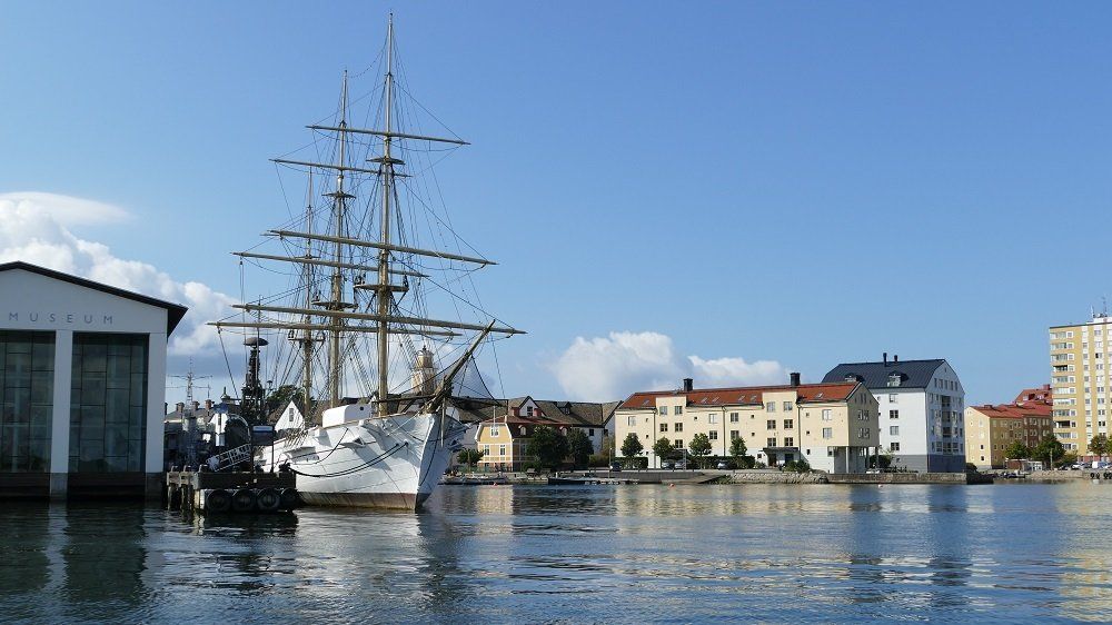 Wir kommen gerade einmal nach Ahus und sind dort 4 Tage eingeweht. Man muss ein Stückweit den Fluss Helge Aa hinauffahren, um zur Stadt und zum geschützten Hafen am Flussufer zu gelangen. Unser Liegeplatz beim örtlichen Segelclub liegt direkt gegenüber der Absolut! Vodka-Fabrik – alte Backsteinarchitektur, deren Fassade abends herrlich angestrahlt wird.