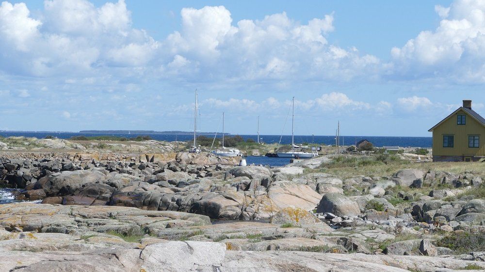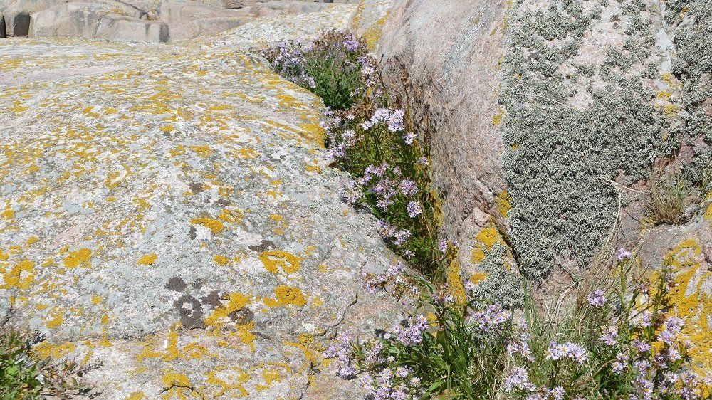 Bäume wachsen auf dieser windumtosten Schäre keine. Auf der Hafenseite ducken sich ein paar Büsche in Felsmulden. Es dominieren Gräser und Flechten, durchsetzt von großen, glattgeschliffenen Granitblöcken.