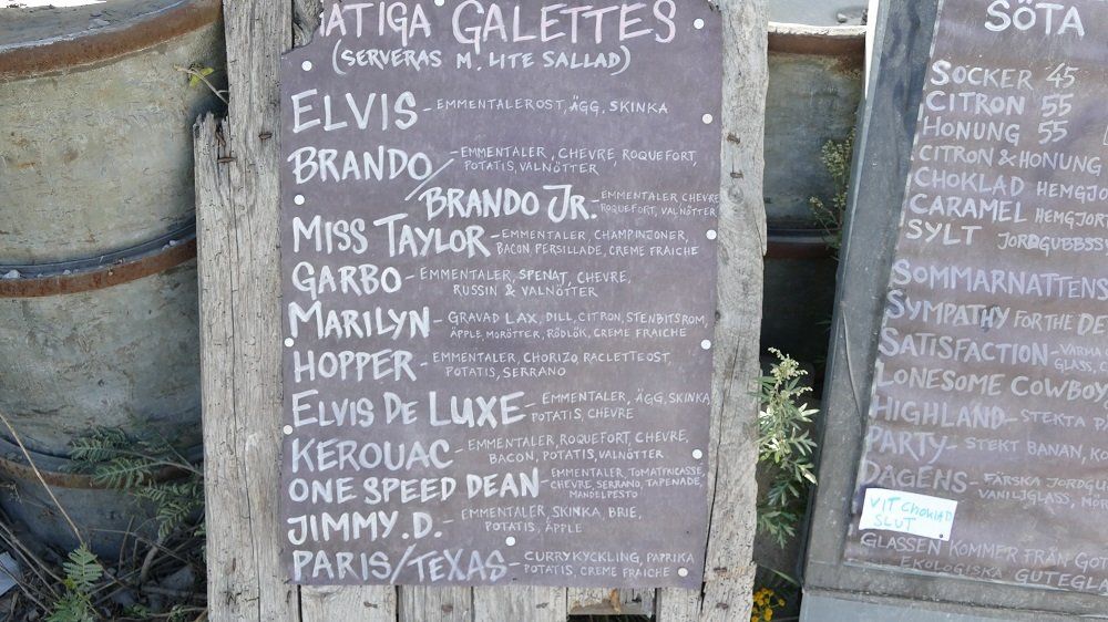 Doch schon nach kurzer Zeit bleibt unser Blick an einem Gebäude hängen: Eine ehemalige Tankstelle, heute Pension und Creperie Tati. Auf der Wiese daneben stehen etliche alte, total verrostete Amischlitten. War auf Farö nicht irgendetwas mit Elvis Presley? Hans hat mal davon was gelesen und ich erinnere mich dunkel an einen skurrilen Mare-Beitrag im Fernsehen. Als wir den Garten des Cafes betreten finden wir von Elvis nicht die geringste Spur. Dafür wähnen wir uns irgendwo an einer italienischen Küste – dieser Blick … Und dann erst die ‚Hembaged‘ Kuchen, wahre Konditoreikunstwerke!