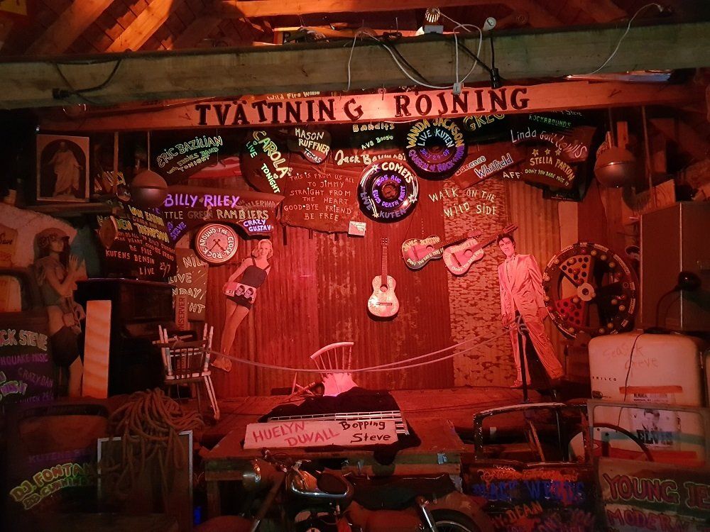 Fasziniert drehen wir uns mit offenem Mund im Kreis, was für eine Dekohöhle! Elvis steht sofort erkennbar in lebensgroßem Pappmaché auf der Bühne. Immer wieder entdecken wir etwas Neues. Wo keine Deko ist, stehen Sprüche an den Wänden: „People of all times need outlaws“ oder „I know I’m older. It doesn’t mean I’m colder!“ oder „Roll over Beethoven, tell Tjaikowsky the news!“ Alles ist einfach nur herrlich abgedreht.