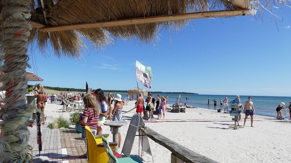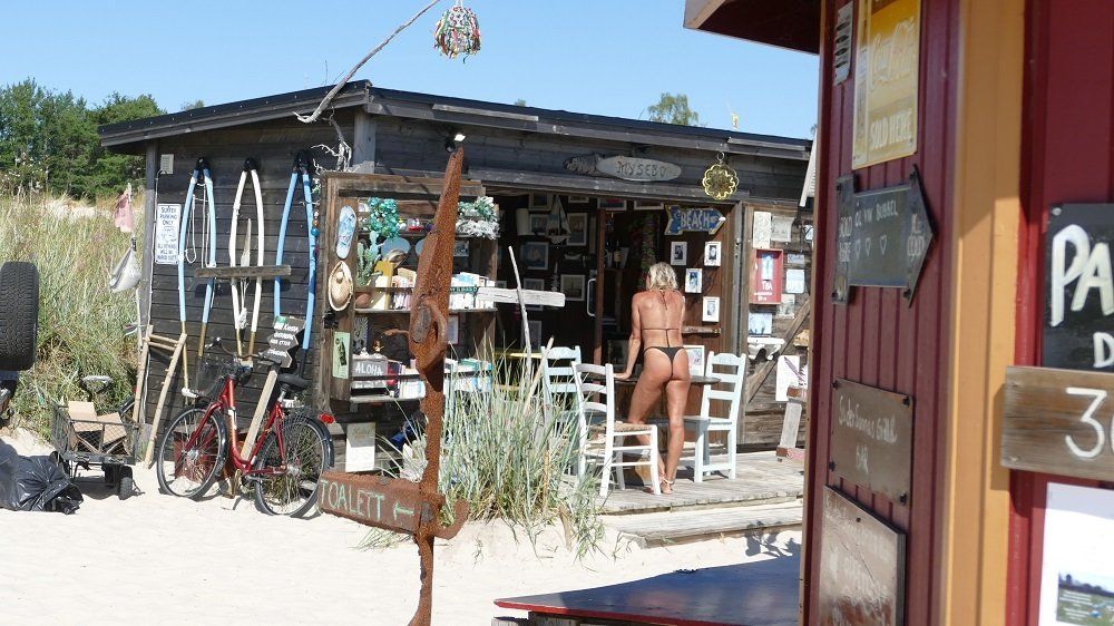 Mitten auf der Insel treffen wir Hans, der von Lickershamn ebenfalls nach Lauterhorn gesegelt ist. Wir radeln gemeinsam weiter. Ein Schild mit Strand, Restaurant- und Campingsymbol erweckt unsere Neugier und lockt uns nach Sudersandvikken und in eine völlig andere Welt hinein. Keine Raukars und Steinstrände mehr, dafür eine große Bucht mit Sandstrand und entsprechendem Strandleben.