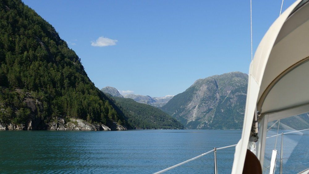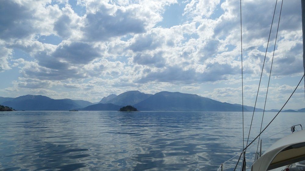 Für die erste Nacht machen wir an einem Felsen in einer geschützten, ruhigen Bucht fest. So richtig stellt sich noch nicht das Gefühl ein, in einem Fjord zu sein – es sieht eher wie ein See im Alpenvorland aus.