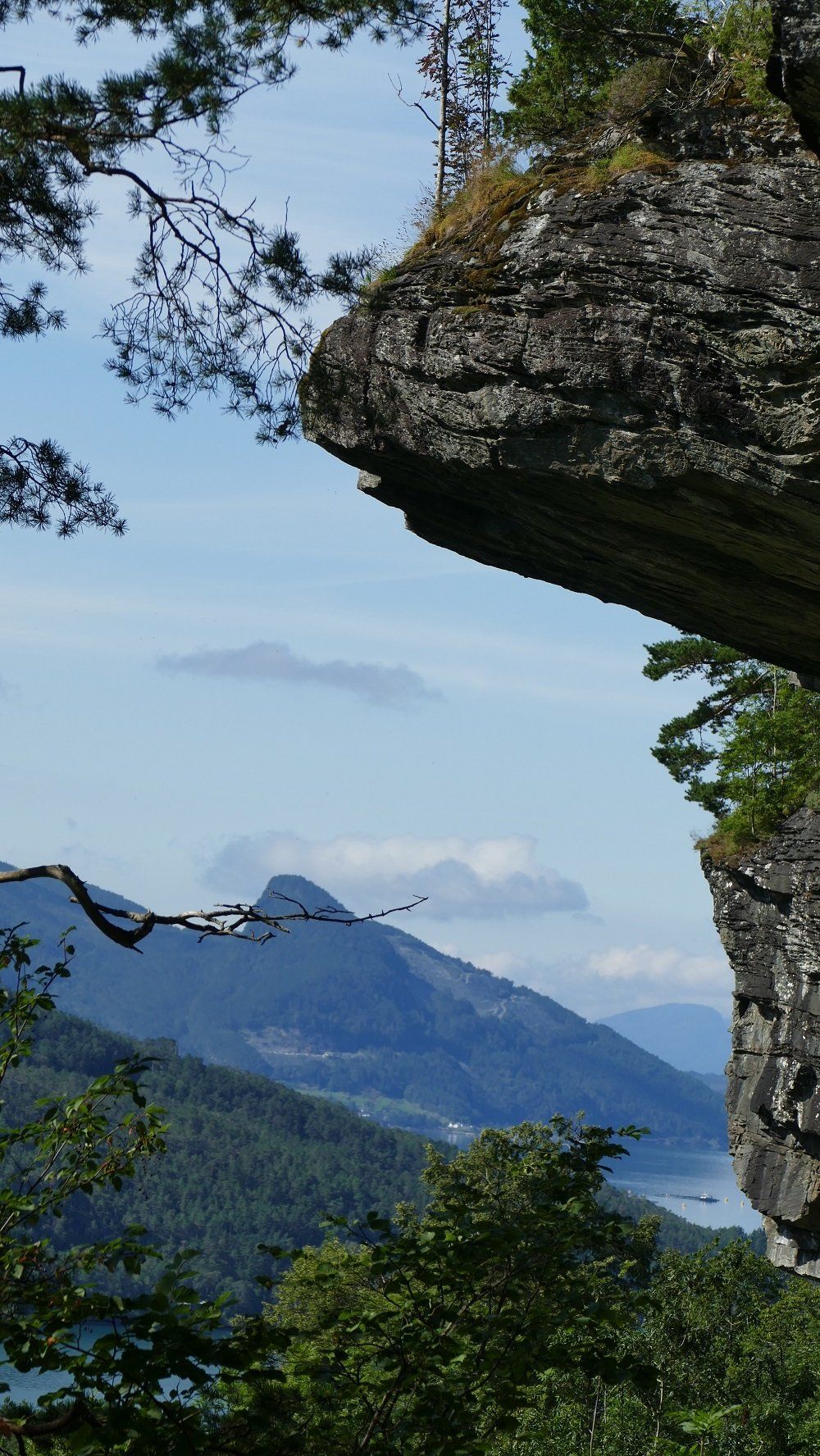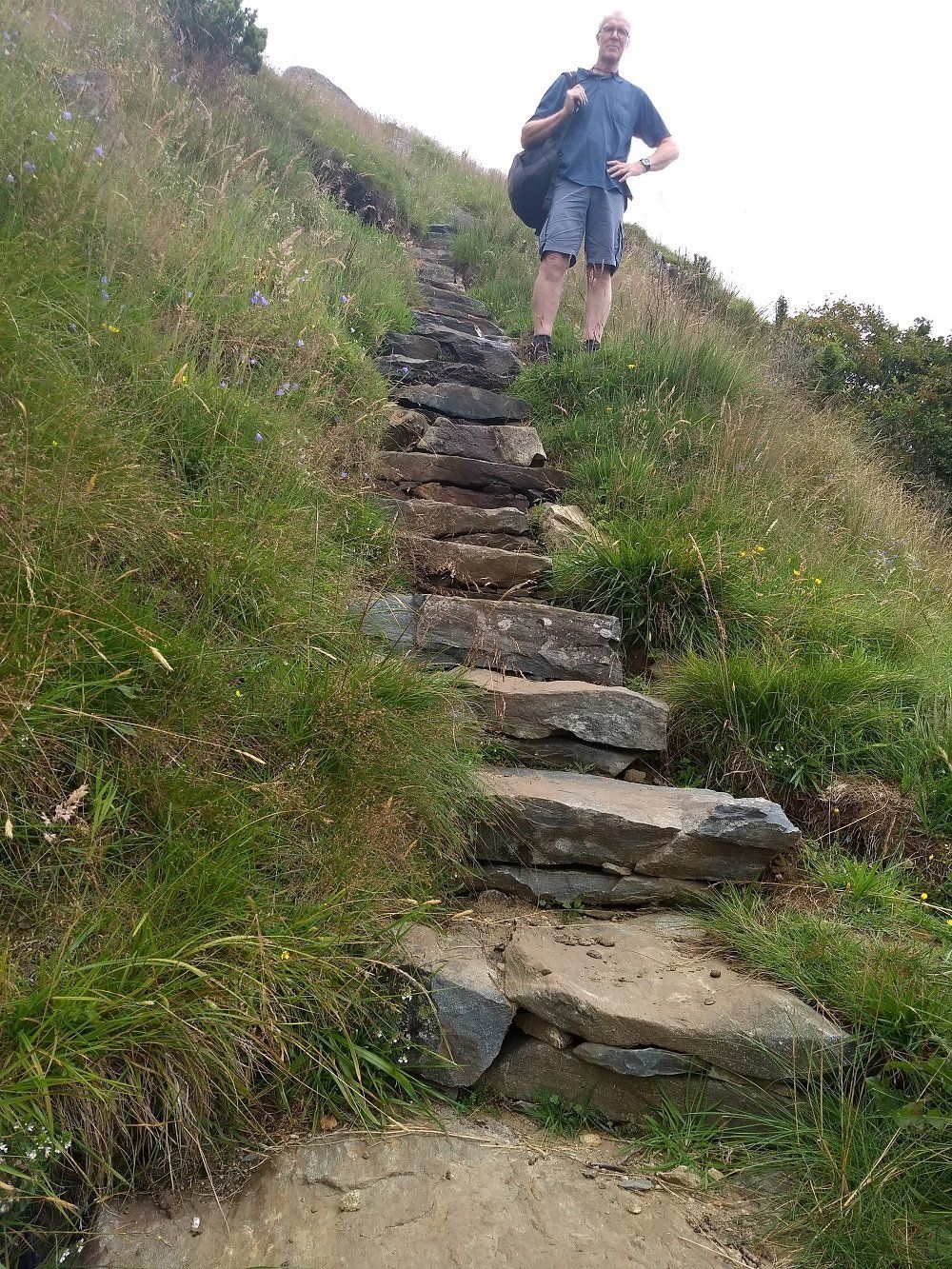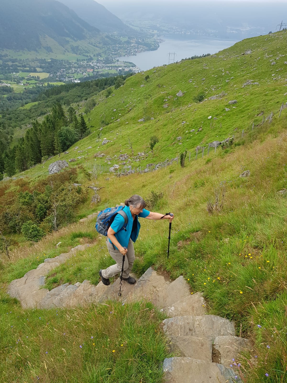 Auf dem Rückweg, die Urlaubssaison neigt sich dem Ende zu, machen wir doch noch einen Stopp in Rosendal und unternehmen eine schöne Bergwanderung. Ein gutes Stück besteht diese aus Treppenstufen hoch zum Gipfel. Verwundert entnehmen wir einer Tafel, dass diese von Sherpas gebaut wurden, wovon auch die Gebetsfahnen in den Bäumen zeugen.