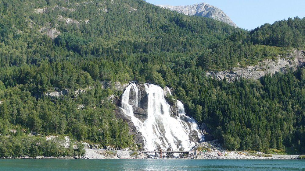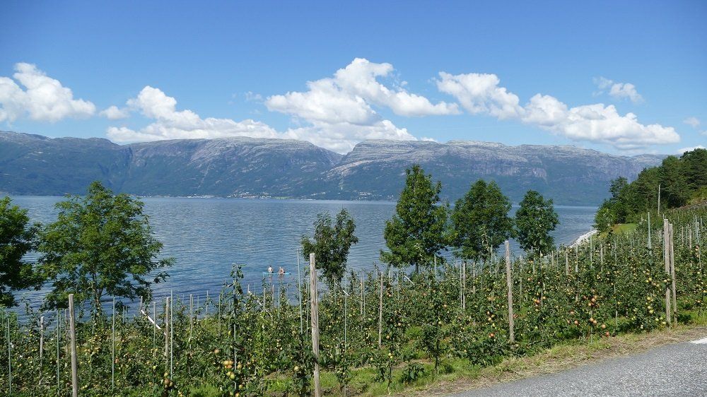 Die Uferstraße liegt nicht immer am Ufer, es sind dabei in paar kleinere Berge und Steigungen zu bewältigen. Einmal geht es sogar 295 anstrengende Meter hoch. Aber fantastische Blicke über den Fjord bieten mehr als Entschädigung. Manchmal vermuten wir uns eher am Gardasee oder Lago Magiore als im Hardangerfjord. Den Rückweg können wir teilweise mit einer Fähre bewältigen, haben aber dennoch 50 beeindruckende Kilometer mit etlichen Höhenmetererradelt.