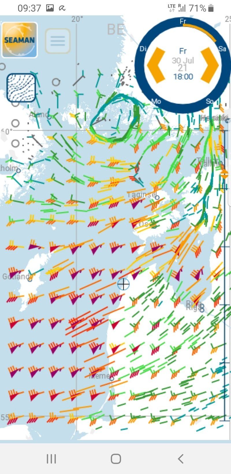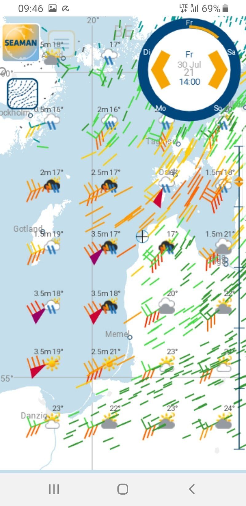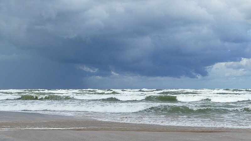 Ein heftiger Sturm kündigte sich an. Wir mussten uns entscheiden: Abwettern in Pavilosta oder schnell noch nach Ventspils weitersegeln. Weiter! Viel Welle und wenig Wind von hinten bedeuteten jedoch erst eine elende Schaukelei und anstrengendes Steuern, bis der Wind sich nach zwei Stunden erbarmte und endlich der Windvorhersage entsprach.