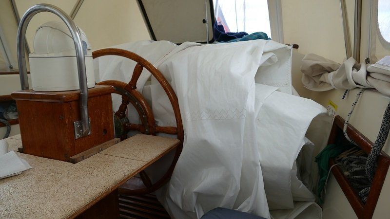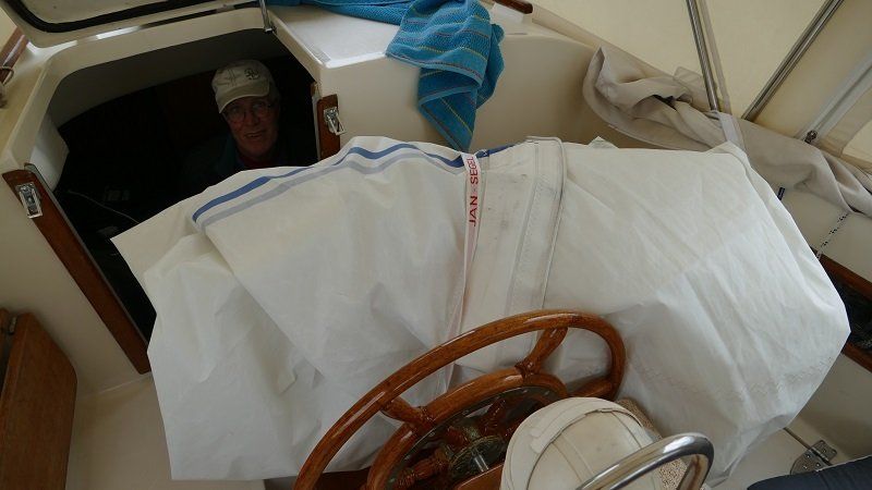 Natürlich auch dieses Mal! Wir hatten sie schon halb zusammengelegt, da lief das Tuch einfach wieder auseinander und verbreitete sich auf dem ganzen Vordeck! Wutentbrannt raffte Gerd den ganzen Klumpatsch zusammen, zerrte den formlosen Haufen in unsere Achterkajüte und kam dann selbst nicht mehr raus. Also unsere Genua, die seitdem Dschinn aus der Flasche heisst, wieder ins Cockpit gezerrt, den Skipper befreit und das Ganze wieder zurück.