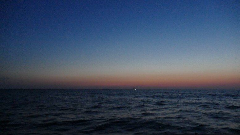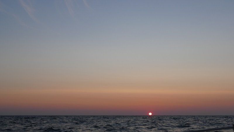 Um aus dem Windschatten von Gotland zu kommen motorten wir fast eine Stunde und trafen dabei auf mehr alte Welle als auf frischen Wind. Genua und Groß stabilisierten diesen Schlingerkurs nur bedingt. Die aus dem Meer aufsteigende Sonne bot eine wunderschöne, aber nur kurzzeitige Ablenkung.